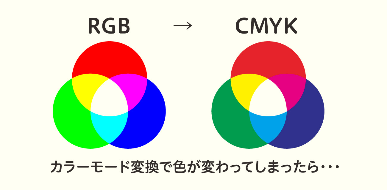 - RGBとCMYKの色の差に注意する。モニターで見た鮮やかな色は、印刷時にくすんで見えることがある。名刺やチラシにも使うなら必ずCMYKでも確認する