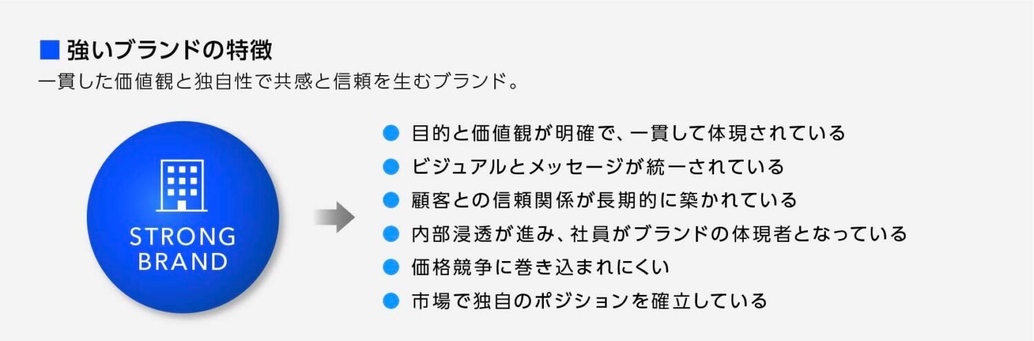 強いブランドは、顧客が「安いから」ではなく「このブランドだから」という理由で選びます。この状態になると、多少高くても選ばれる、値引き要求が減る、リピート率が上がるという好循環が生まれます。